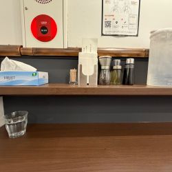 12:50頃訪問。先客1名後客6名。店内は奥に向かって細長い間取りとなっており、入って左右の壁に対面するカウンターが設けられている。清潔でまずまずの居心地。男性2名女性1名による切り盛りで、接客は良好。