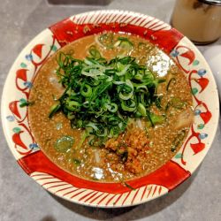 スープは、やや暗めの色合いに茶濁しており、ドロリとした質感。表層に白胡麻がタップリと散らされる。