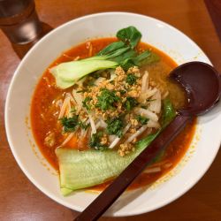 半地下の店内はオレンジ色の壁紙の落ち着いた、今日現在4人掛けテーブル席が4卓と2人掛けテーブル席が1卓(席数変更可)ありお水は入って右側の冷水機にてセルフ(椅子下に荷物カゴ、左側奥にお手洗いあり)。