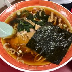 チャーシューは煮豚タイプ、結構分厚くそれなりに柔らかい。その他具材はメンマ、ワカメ、ネギ、海苔のラインナップ。