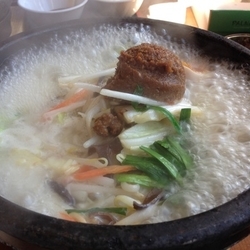 仕事先での一杯。320度の石焼鍋で作られたラーメンはグツグツと煮え立っています。取り皿に入れながら食べますが、なかなか減らない…麺量はそんなにないのですが、野菜の量が見た目以上。最後はおじや用のご飯を投入して完食です。かなりのボリュームに満足。大変美味しくいただきました。ごちそうさまでした。