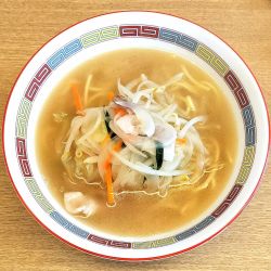 ご飯ものもいろいろとある中,初志貫徹でちゃんぽんを注文して待つことしばし。登場したのは長崎ちゃんぽんとは明らかに違う澄んだスープに具だくさんな様相の一杯です。
