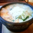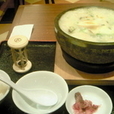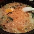 石焼き鍋にスープを投入するとグツグツとスープが煮たって火山のようにボコボコ噴火するということらしい。そんな演出はどうでも良いんだが、熱々のスープは猫舌にはキツい。小皿に取り分けようとしたんだが、