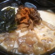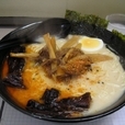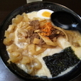 乳白色のスープで極細麺、ノリが二枚、ゆで卵の半切りにネギ、牛しぐれ煮が乗っている。