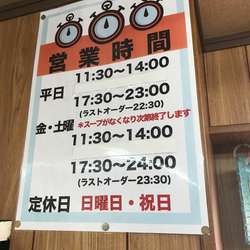 | 営業時間 | 11:30〜14:00/17:30〜23:00 [金・土] 11:30〜14:00/17:30〜24:00 ※夜のラストオーダーは各30分前 |