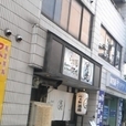 ・店の外観:青い看板、白い看板・暖簾、赤い提灯。