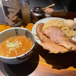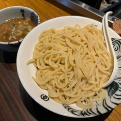 久しぶりのこちら、豚魚スープはほどよい粘土でサラリといただける。うどんのような極太麺は2.5枚盛り茹で前450gと迫力十分。ムッチリとした食感でつけ汁も良く絡む。