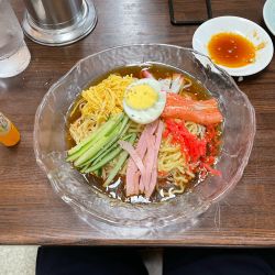 12時頃訪問。先客2名後客4名。店は2階にあり、程好いスペースに3つのテーブル席と1列のカウンター。結構な年季が入っており雑然とした雰囲気。割と高齢の男女各1名による切り盛りで、接客は普通。