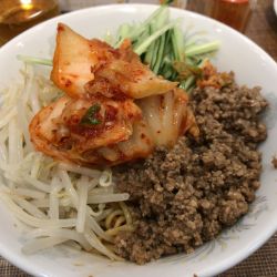 野菜はキャベツ、もやし、にら、ニンジンが入っていて、少量豚肉が入ってました