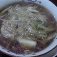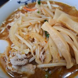 麺は縮れた平打ちの太麺です。スープも麺も熱々です。具材はモヤシを中心に、キャベツ、ニンジン、タマネギ、ニラ、豚ばら肉でした。醤油のうま味が濃厚なスープにはコショウがふりかけられており、ピリッとします。絶品です。