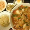 注文してから7~8分経った頃に、トレーに乗せられてラーメンと炒飯セットが運ばれて来たので、早速何時もの通り、スープから先に頂いてみましょう。
