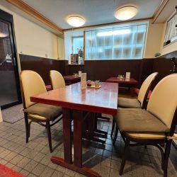 半地下にある店内は年季の入ったコンパクトな、今日現在1階は4人掛けテーブル席が2卓、6人掛けテーブル席が1卓、4人掛け小上がり席が2卓ありお水と紙おしぼりは出して頂きました(入口正面にお手洗いあり)。
