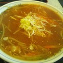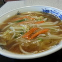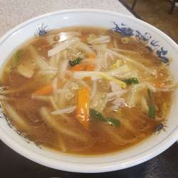 モヤシ、ニンジン、白菜、豚バラ肉のあんかけがたっぷりかかっています。細麺も固からず柔からず、歯ごたえもよいですね。正油スープも塩気も控えめ。旨味たっぷりです。