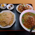 ラーメン一人前、チャーハン一人前、山盛りの唐揚げ皿。ラーメンは数種類から選べます。