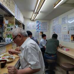 日曜昼時、入口付近のおっさんかき分け、奥のカウンター席に着。