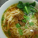 醤油スープに具材は挽肉、モヤシ、青菜、パクチー。