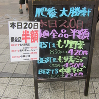 熊本「肥後大勝軒」の「中華そば」、九州までつけ神様のDNAが宿ってると知り、急行します。店前には神様の写真がデカデカ、11時から翌朝2時までのロング営業と記されたので、どんなお店カナと入ったら、麺以上におつまみメニューがいっぱいの、居酒屋使いを兼ねた、独自にガラパゴス大勝軒でした。中華そばは意外にスッキリした東京中華そば系で、豚骨感ありませんでしたがオッケー。