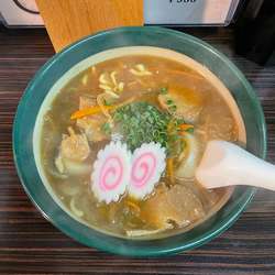 カレーらーめん(950円)を、太麺で。スープは、強いトロミと、しっかりとしたカレー感。辛味は穏やかで、やや甘めのチューニング。卓上の一味でカスタマイズ。麺は、太麺をチョイス。むっちりとした麺は、強めのスープをしっかりと受け止める。具は、なると・小ねぎ・玉ねぎ・にんじん・チャーシュー。こちらは2回目の訪問。前回は、生姜らーめんをいただいたが、カレーらーめんに軍配です。