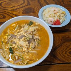 「カミナリラーメン(大盛)+半エビチャーハン」@赤城ラーメンの写真カミナリラーメンは、コンニャク、ひき肉、白菜、ザーサイなどが乗ったピリ辛ラーメン!