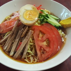 冷やし中華って、やっぱ具材が何かが問題です。ここではトマト・チャーシュー・紅ショウガ・キュウリ・茹で卵半分・カニかま・かまぼこ