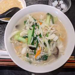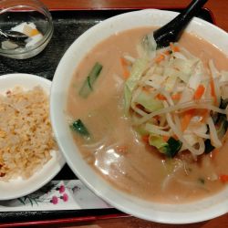 メニュー写真の野菜盛りより実物はやや寂しいが、それでももやしやニラなどの野菜がたっぷり。スープは濃い口の味噌スープで、生姜をじんわり感じます。