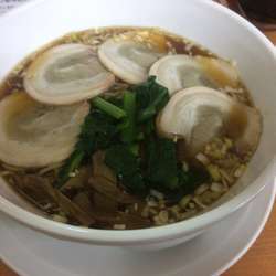 麺はかん水で黄色がかった中華麺、スープは優しく甘みのあるスープ。チャーシューは薄めが5枚。ほかに青菜、メンマ、ネギ。
