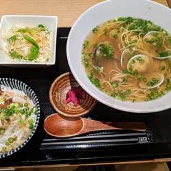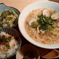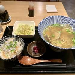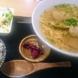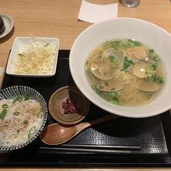 はまぐりラーメンのセット(しらすごはん、サラダ、漬物付き)をいただく。