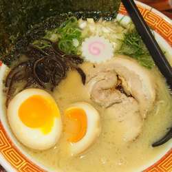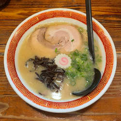 | 備考 | 九州博多とんこつラーメン。 食券前払い制、水セルフ 薬味=胡椒、白胡麻、紅生姜、おろしニンニク、激辛高菜炒め |