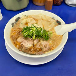 来来亭のラーメンに、ワンタンをのせただけだが、意外に濃い背脂スープに合う。