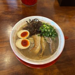 臭みのある豚骨スープ+固めの極細麺の組み合わせで王道の九州豚骨という印象。味玉が濃厚でなかなか美味い。チャーシュー、ネギ、キクラゲに卓上の紅ショウガなど、トッピングも含めてしっかり九州... 続きを見る