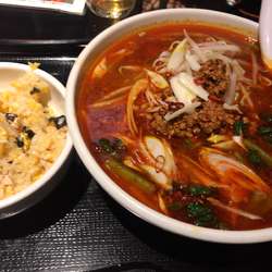 東京は築地、銀座か?[中国料理・東方一角]にてランチ、麻辣麺+半チャーハン880円。「超辛い」と書かれている。