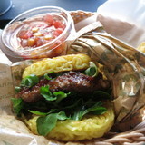 注文から数分で出来上がり、フォーク、ナイフで食べる方式でなく、手でかぶりつくもの