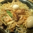 ビジュアルは一見‘海鮮焼ちゃんぽん’といった風情。牡蠣、海老、イカゲソ、豚肉、ウズラ卵、チクワ、キャベツ、ニンジンと言った具が炒められて入ってます。