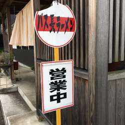 お店の入り口前にはバス停のような物が置かれ営業中とありますよ!