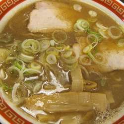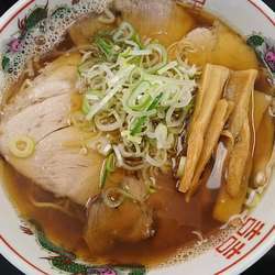 煮干し特有の泡と動物系のスープが合わさった、津軽ではおなじみのスープ。程よい歯ごたえのメンマ、チャーシュー、ネギがトッピングされています。煮干しの風味と濃厚すぎないまさに中濃の旨みたっぷりのスープ。甘みの少ない、青森市スタイルの醤油ダレがこのスープによく合います。