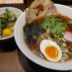 【注文】煮干し醤油ラーメン(700円)。ランチサービスのネギチャーシュー丼も付けてもらう。