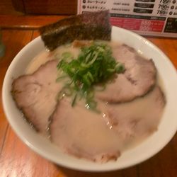 漂う豚骨臭に誘われ入店、12時前というのに店内はほぼ満席です。やや多めの油で覆われたスープは、思ったよりもライトですが、旨味もしっかり感じられ後を引きます。中細ストレート麺はデフォルトでも固さバッチリ。肩ロースの薄切りチャーシューは噛みしめる度に肉の旨味が感じられます。