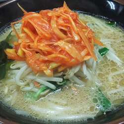 具として、中央には炒められたモヤシ、人参、ニラが適度に多めに盛り付けられる。十分に熱が通りながらも食感がしっかりめに残されていて絶妙。
