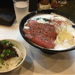 ホルモンやニンニク野菜といったものがのり 上に生卵がかかっているラーメン とても美味しい この店はメインの牛そばよりもまぜ麺や牡蠣醤油ラーメンなどメインでないものの方が美味しい いつも空いているが船橋の人はセンスがないのだろうか?