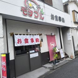 「お食事処」っぽい外観、ちょとポップな店名看板、白地のれん、エンジ地幕看板、赤のぼり、メニュー掲示あり、ごく普通のこげ茶色アルミ枠引き戸。